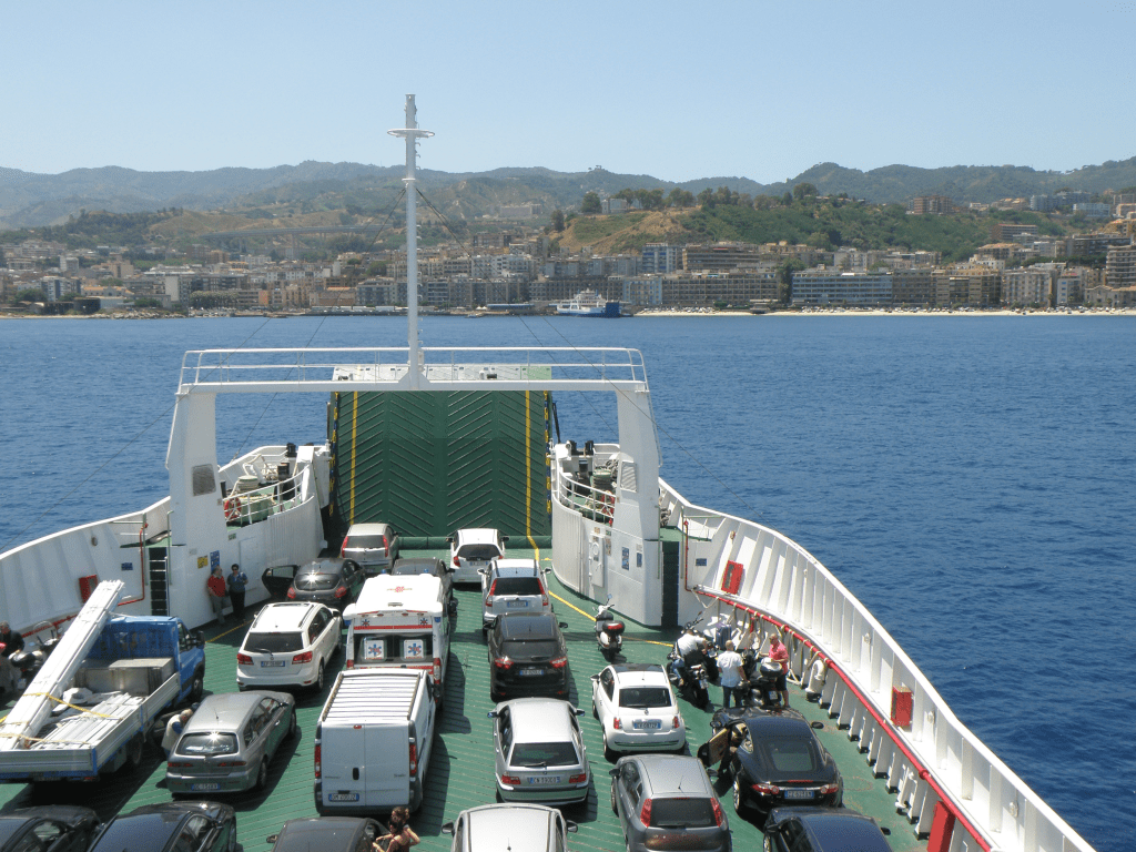 Unless…unless you use those feet or other conveyance to board a ferry to make the crossing. I’m quite familiar with the twenty-five-minute ferry ride between Villa San Giovanni, Calabria, and Messina, Sicily, (over the Strait of Messina). Like ants entering a mound, you patiently wait your turn to enter. It seems impossible from way back in the queue that all the vehicles waiting can fit on top or in the belly of the ship—but somehow, you and they do.